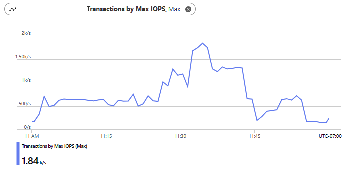 Now when we compare the average IOPS against the Transactions by Max IOPS, we see that under peak load we were achieving 1,840 IOPS, which is a better representation of the workload's ability at scale.