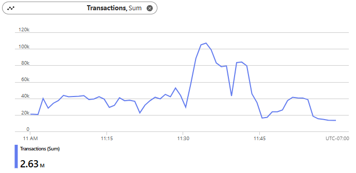 To view in Azure Monitor, select the Transactions metric and Apply splitting on response types. The Metadata response types only appear in the drop-down if the activity occurs within the timeframe selected.