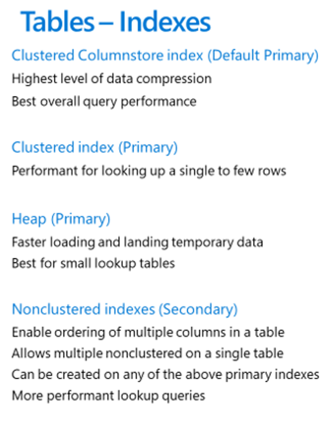 When you configure the Azure Synapse environment, it makes sense to only implement in-use indexes. Azure Synapse currently supports the index types shown here: