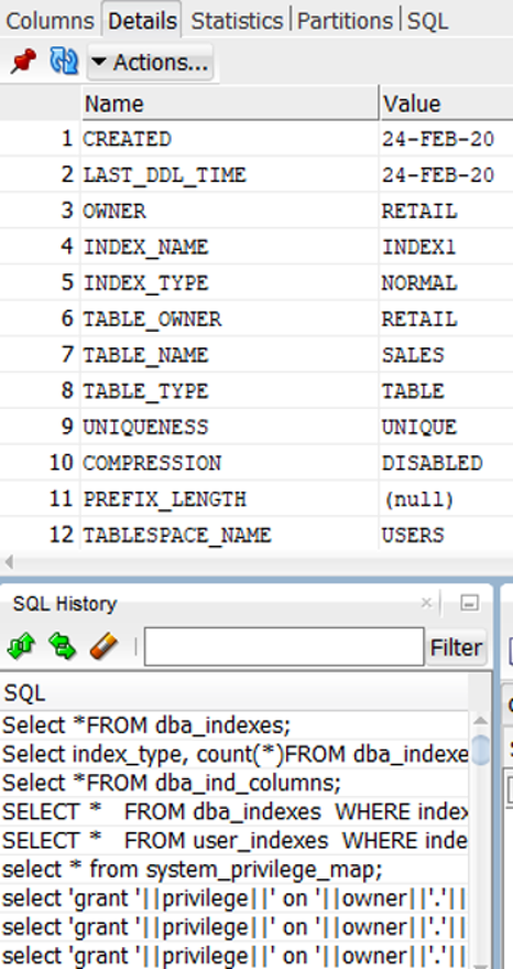 ALL_INDEXES,DBA_INDEXES,USER_INDEXES, andDBA_IND_COL. You can use the built-in queries in Oracle SQL Developer, as shown in the following screenshot.Or, run the following query to find all indexes of a given type:
