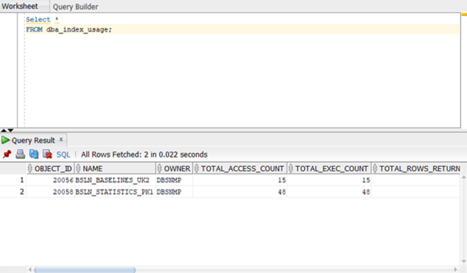 dba_index_usageorv$object_usageviews when monitoring is enabled. You can query those views in Oracle SQL Developer, as shown in the following screenshot.