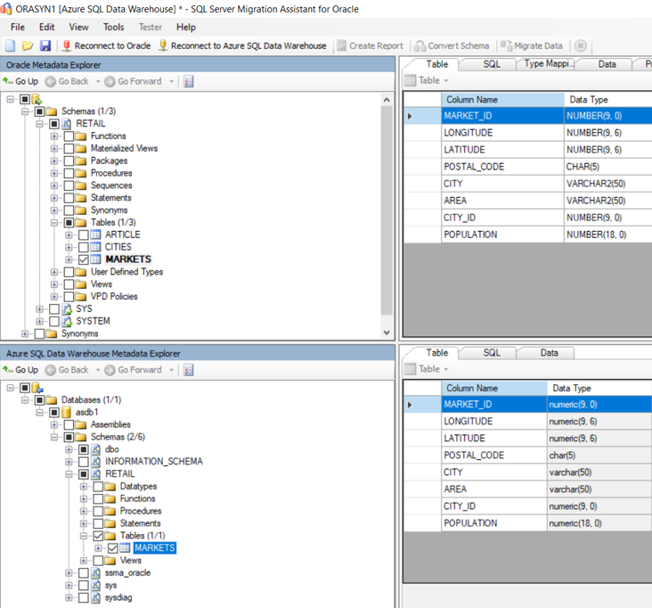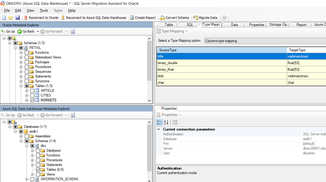 Or, you can use SSMA for Oracle to migrate tables from an existing Oracle environment to Azure Synapse. SSMA for Oracle will apply the appropriate data type mappings and recommended table and distribution types, as shown in the following screenshot.