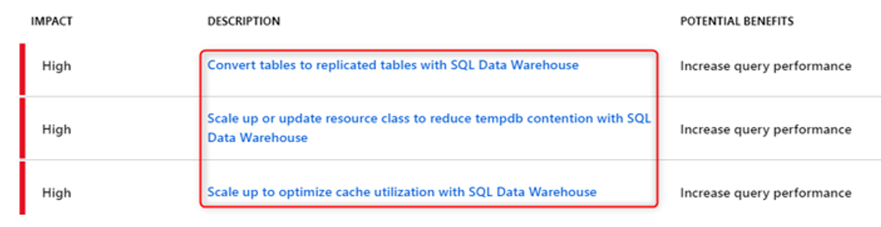 The Azure portal can also provide recommendations for performance enhancements, as shown in the following screenshot.
