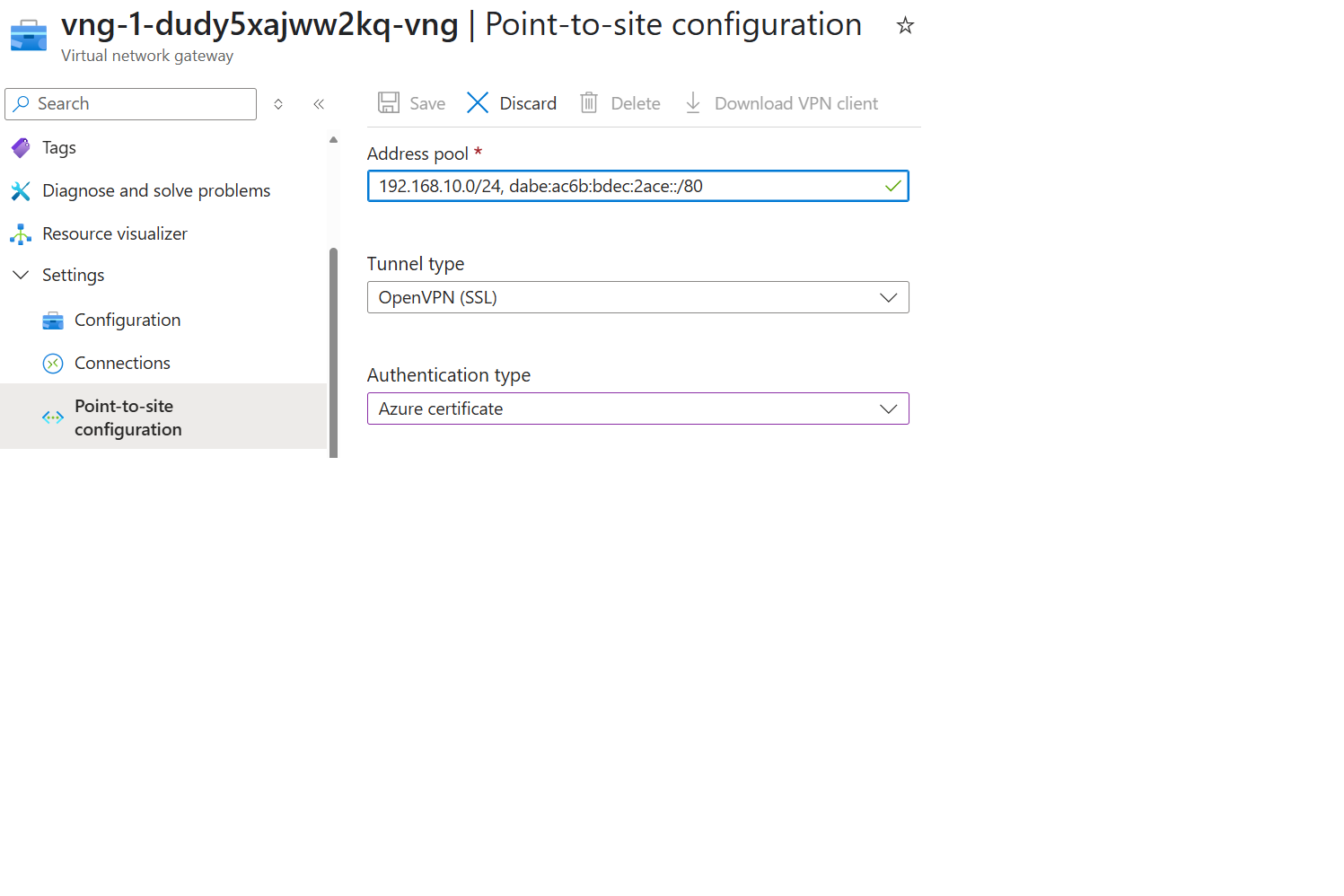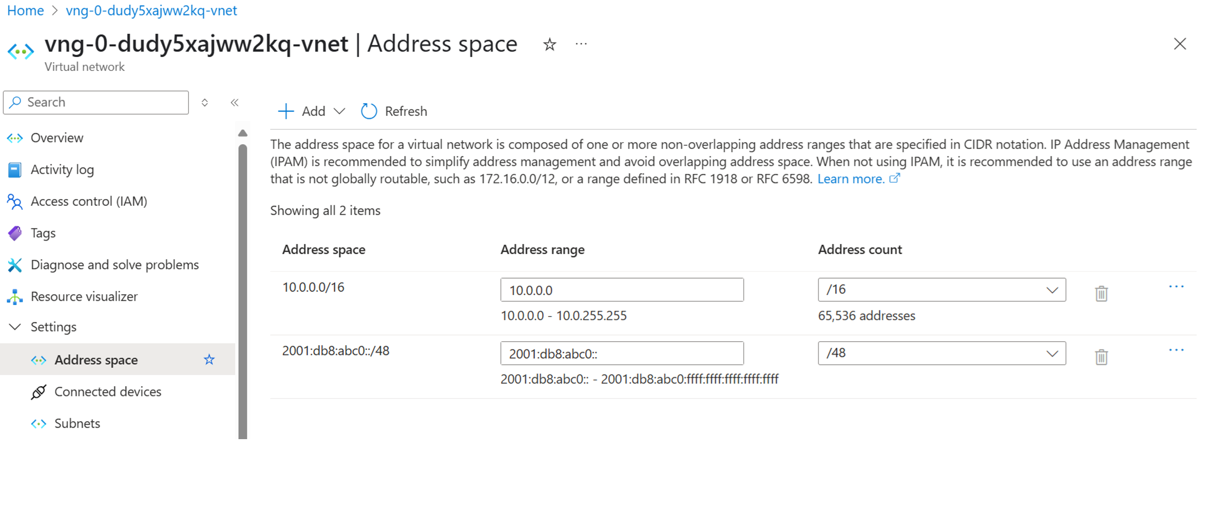 This article helps you configure IPv6 in dual stack for VPN Gateway using the Azure portal. Configuration steps are similar to the existing IPv4 configuration. You can also use PowerShell, or CLI for this configuration. If you use PowerShell or CLI, you can configure IPv6 addresses along with IPv4 addresses.
