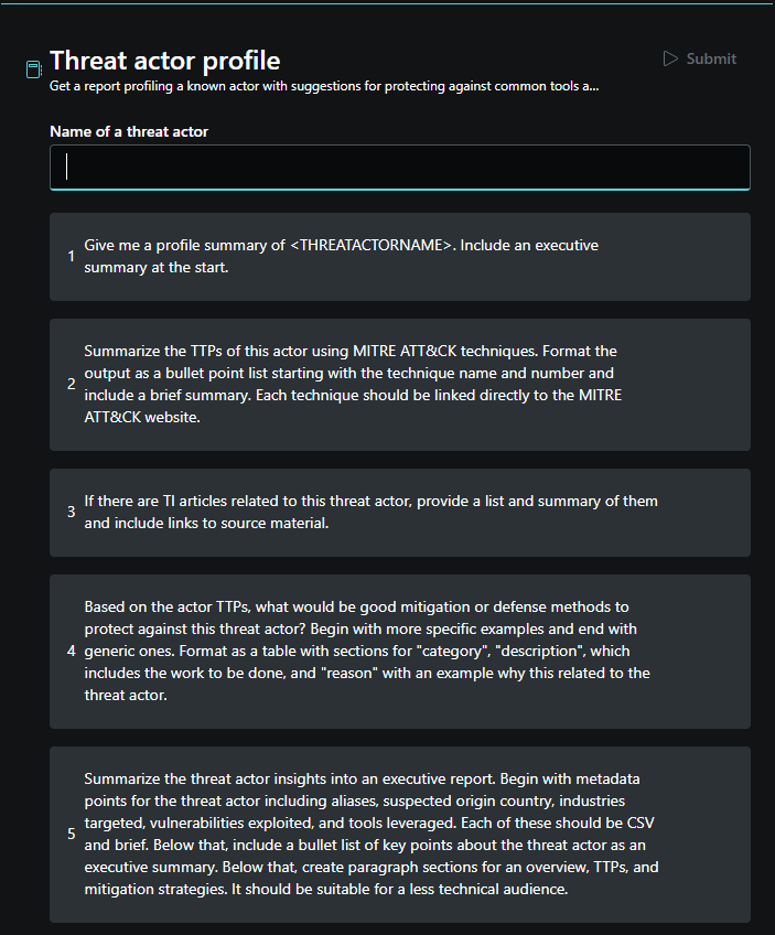 The threat actor profile promptbook is a quick way to get an executive summary about a specific threat actor. The promptbook looks for any existing threat intelligence articles about the actor, including known tools, tactics, and procedures (TTPs) and indicators, including remediation suggestions. It then summarizes the findings into a report for less technical readers.