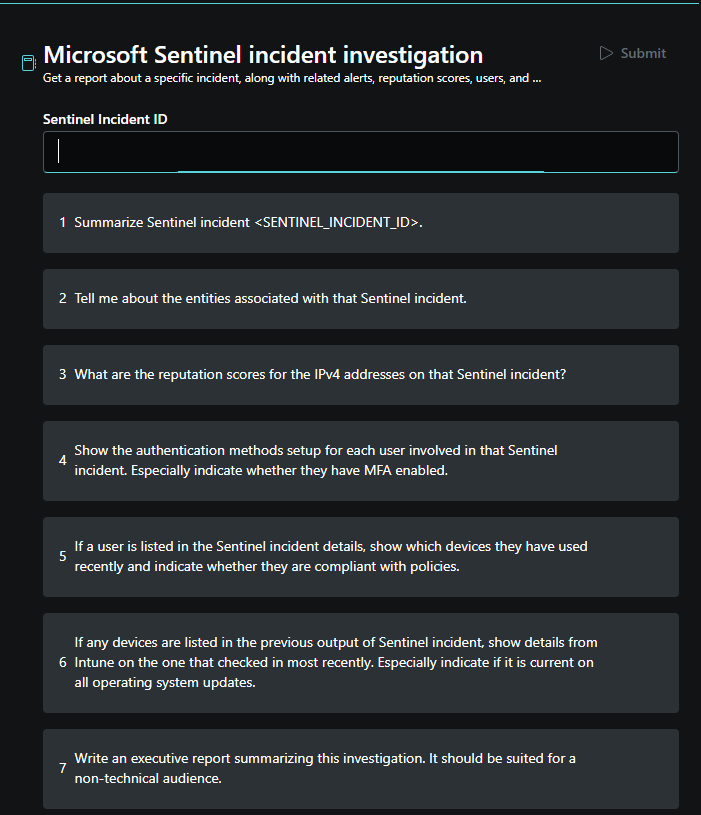 You can run the incident investigation promptbook after supplying an incident number to either the Microsoft Sentinel or Microsoft Defender XDR plugin. Use the appropriate promptbook for the plugin you want to use. The incident investigation promptbooks contain several prompts to generate an executive report for a nontechnical audience that summarizes the investigation. Each prompt builds on the previous prompt.