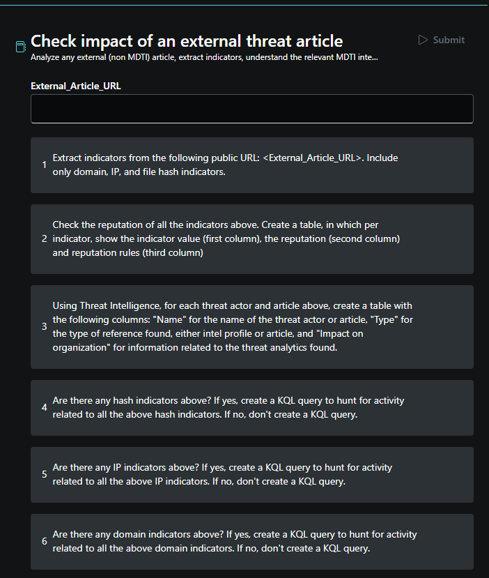 Using this promptbook, you can analyze any external threat intelligence articles to extract indicators from it and gather any relevant Microsoft Defender Threat Intelligence article.