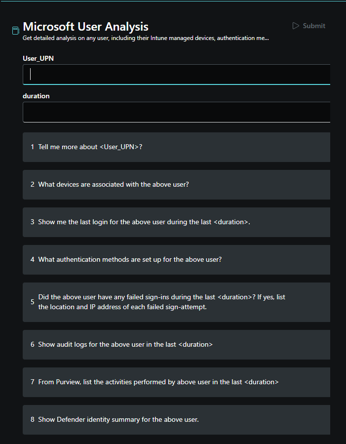 The Microsoft User analysis promptbook can be used by an IT Admin to analyze and get detailed insights about a user and associated devices across multiple Microsoft 365 products. This includes sign-in and authentication data from Microsoft Entra ID, device information from Intune, unusual activity details from Microsoft Purview, and a Microsoft Defender summary highlighting important detections.
