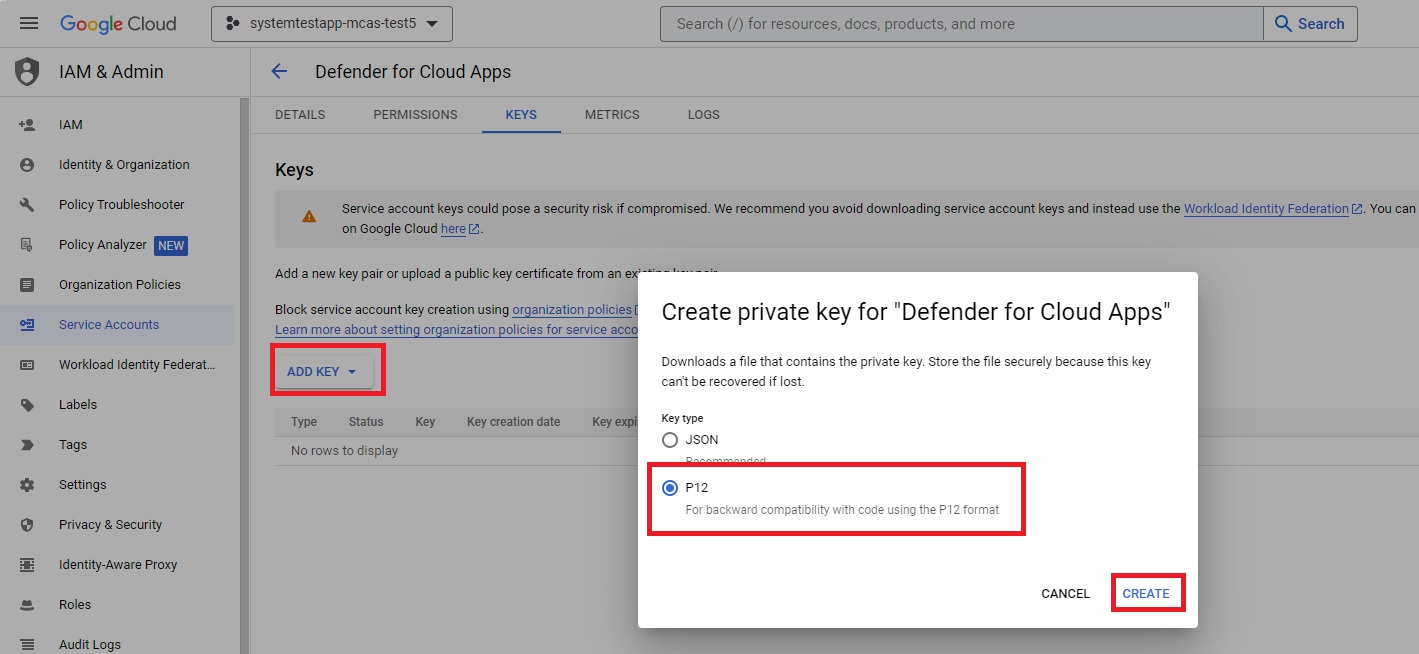Select P12, and then select CREATE. Save the downloaded file and the password required to use the file.