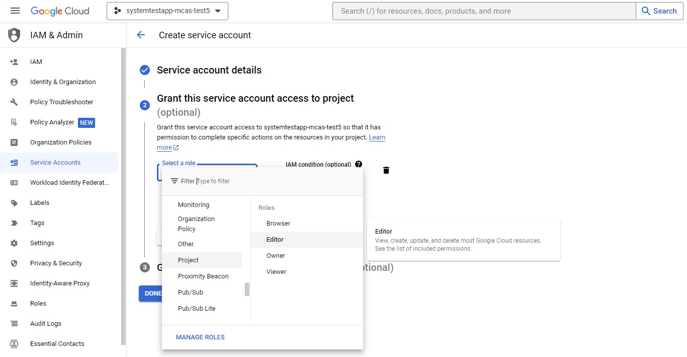 Under Grant this service account access to project, for Role select Project > Editor, and then select Done.