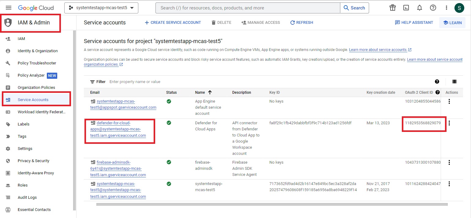 In the navigation menu, go to IAM & Admin > Service accounts. Copy the Client ID assigned to the service account you created - you'll need it later.
