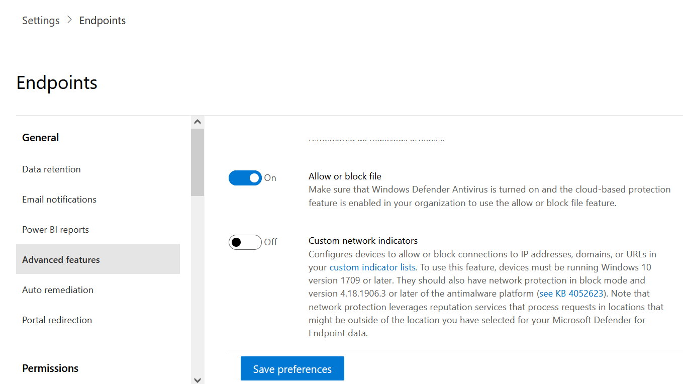 1. In the Microsoft Defender portal, in the navigation pane, select Settings > Endpoints > General > Advanced features > Allow or block file.