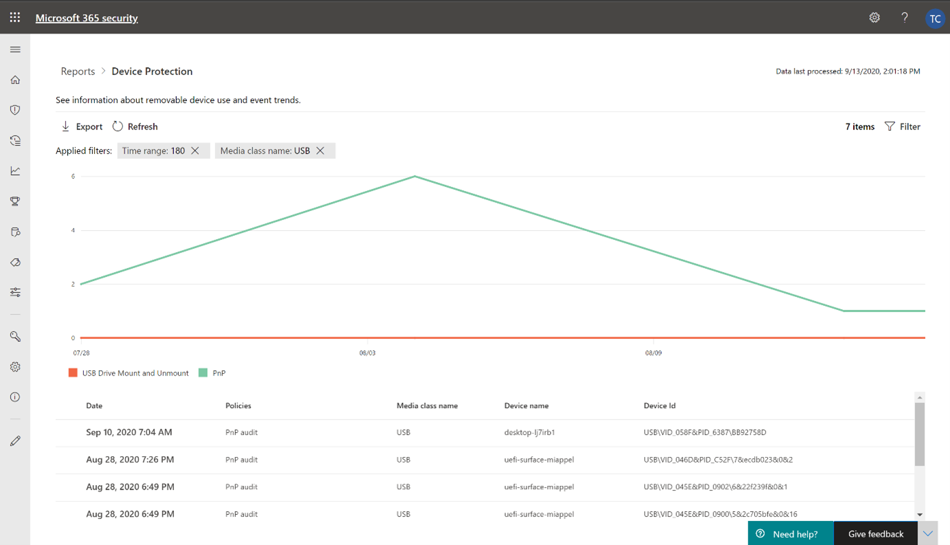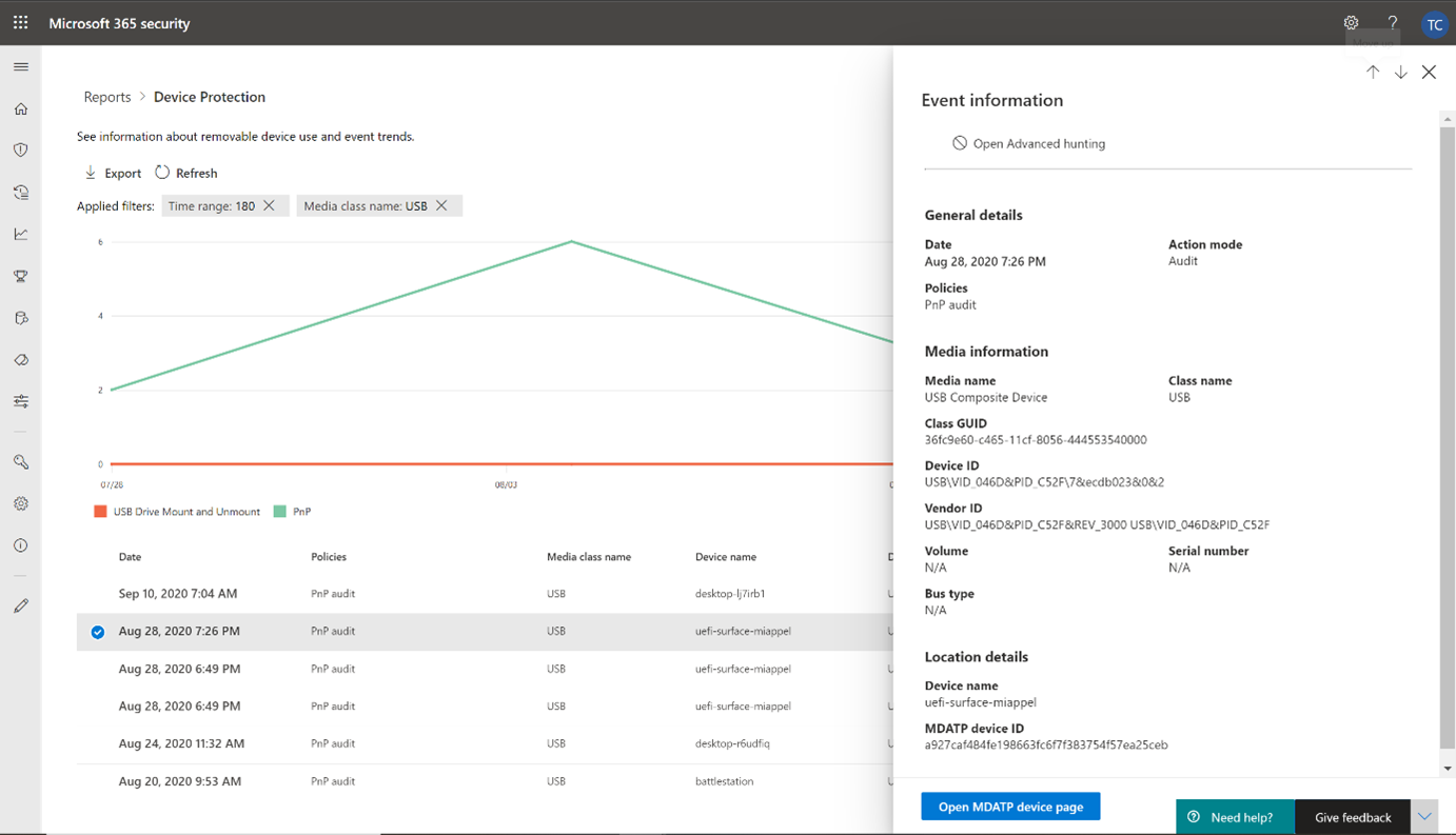 Microsoft Defender for Endpoint device control helps protect your organization from potential data loss, malware, or other cyberthreats by allowing or preventing certain devices to be connected to users' computers. Your security team can view information about device control events with advanced hunting or by using the device control report.