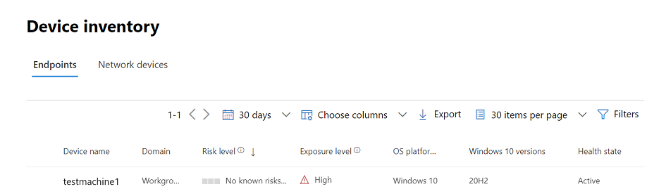 Upon successful onboarding, the device starts showing up on the Devices list in the Microsoft Defender portal.