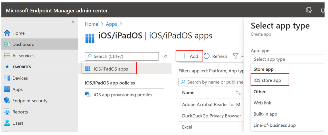 In the Microsoft Intune admin center, go to Apps > iOS/iPadOS > Add > iOS store app and select Select.