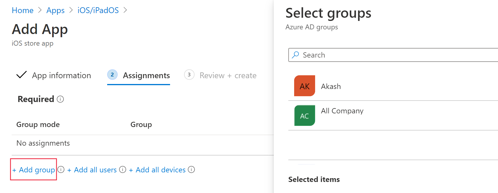 In the Assignments section, go to the Required section and select Add group. You can then choose the user groups that you would like to target Defender for Endpoint on iOS app. Select Select, and then select Next.