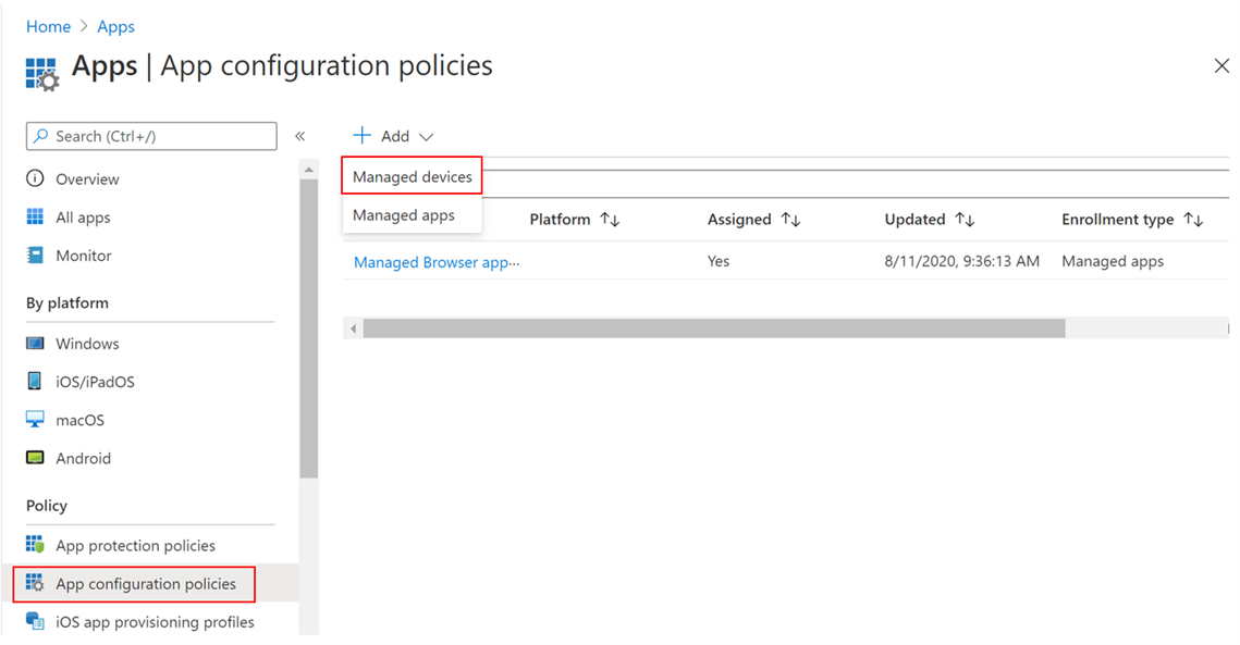 In the Intune admin center, go to Go to Apps > App configuration policies > Add > Managed devices.