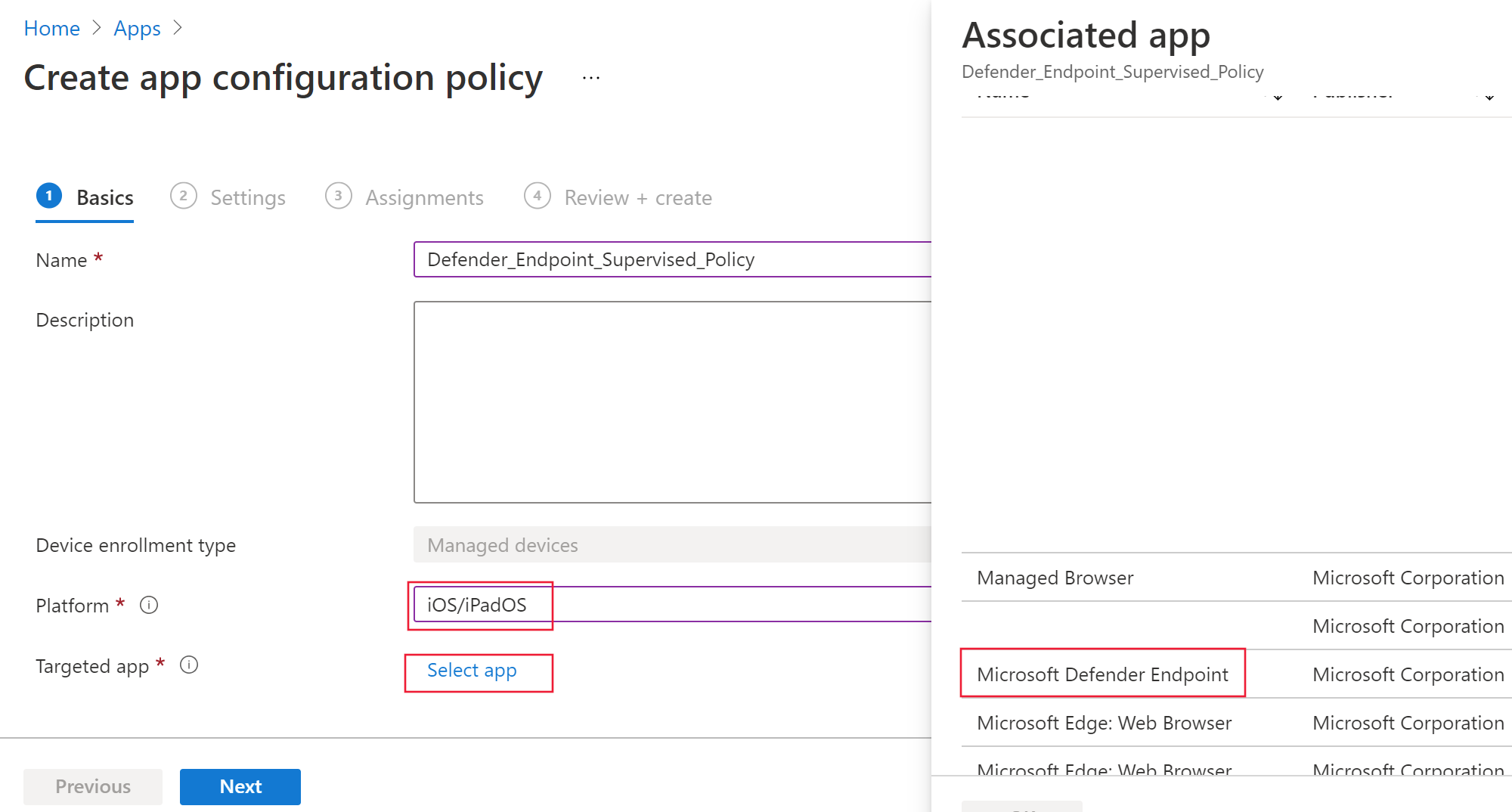 - Targeted app: Select Microsoft Defender for Endpoint from the list