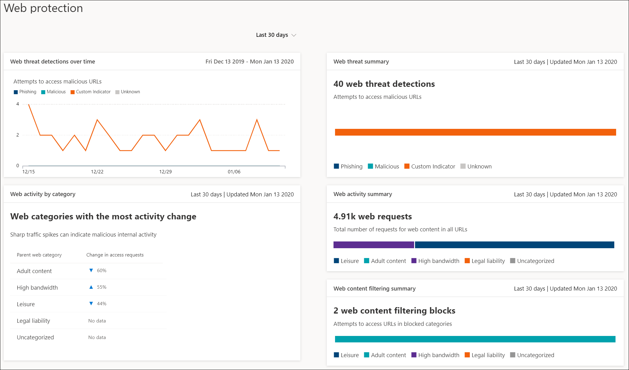 Web protection in Microsoft Defender for Endpoint is a capability made up of Web threat protection, Web content filtering, and Custom indicators. Web protection lets you secure your devices against web threats and helps you regulate unwanted content. You can find Web protection reports in the Microsoft Defender portal by going to Reports > Web protection.