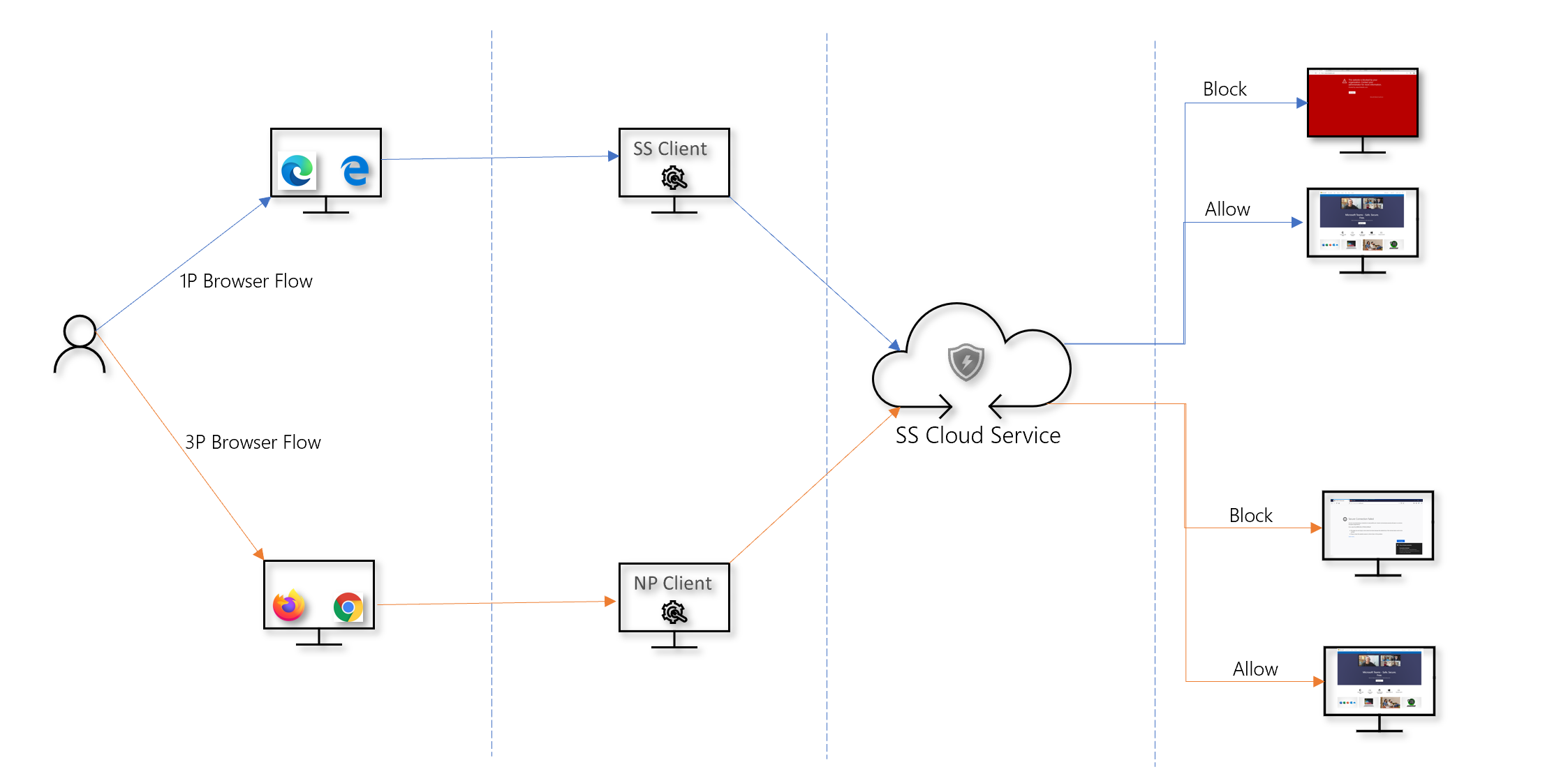 In all web protection scenarios, SmartScreen and Network Protection can be used together to ensure protection across both Microsoft and non-Microsoft browsers and processes. SmartScreen is built directly into Microsoft Edge, while Network Protection monitors traffic in non-Microsoft browsers and processes. The following diagram illustrates this concept. This diagram of the two clients working together to provide multiple browser/app coverages is accurate for all features of Web Protection (Indicators, Web Threats, Content Filtering).