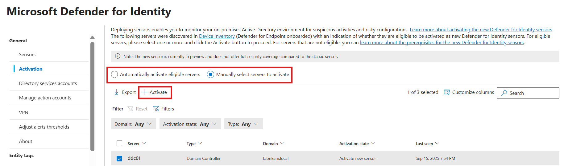 The Activation page displays all servers from your device inventory. Defender for Identity detects all of your servers and their configuration. The server's activation state lets you know what you need to do to onboard the domain controller to Defender for Identity.