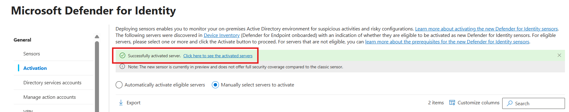 When the activation is complete, a green success banner shows. In the banner, select Click here to see the onboarded servers. This takes you to the Sensors page, where you can check your sensor health.