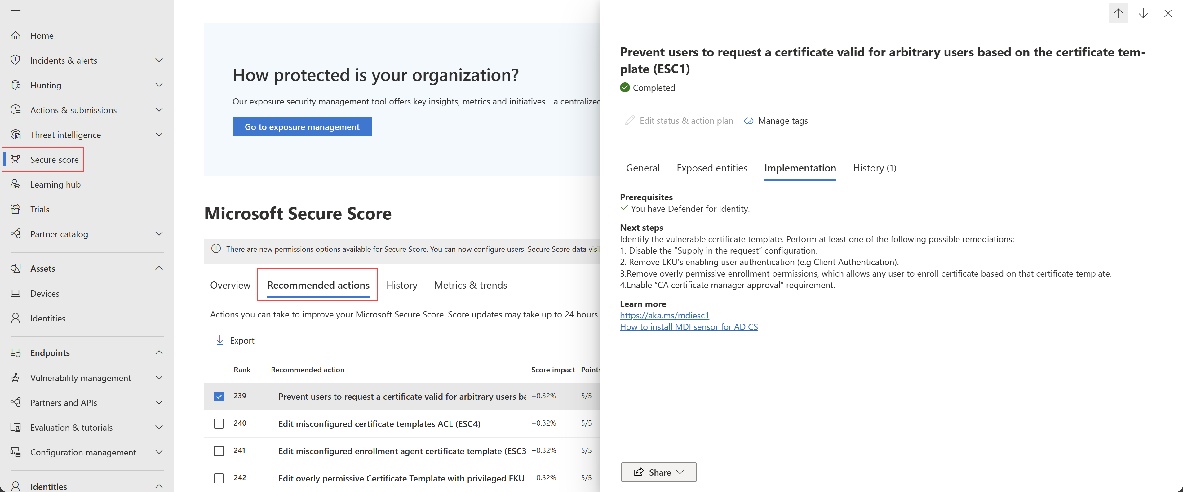 Review the recommended action at https://security.microsoft.com/securescore?viewid=actions for certificate requests for arbitrary users. For example: