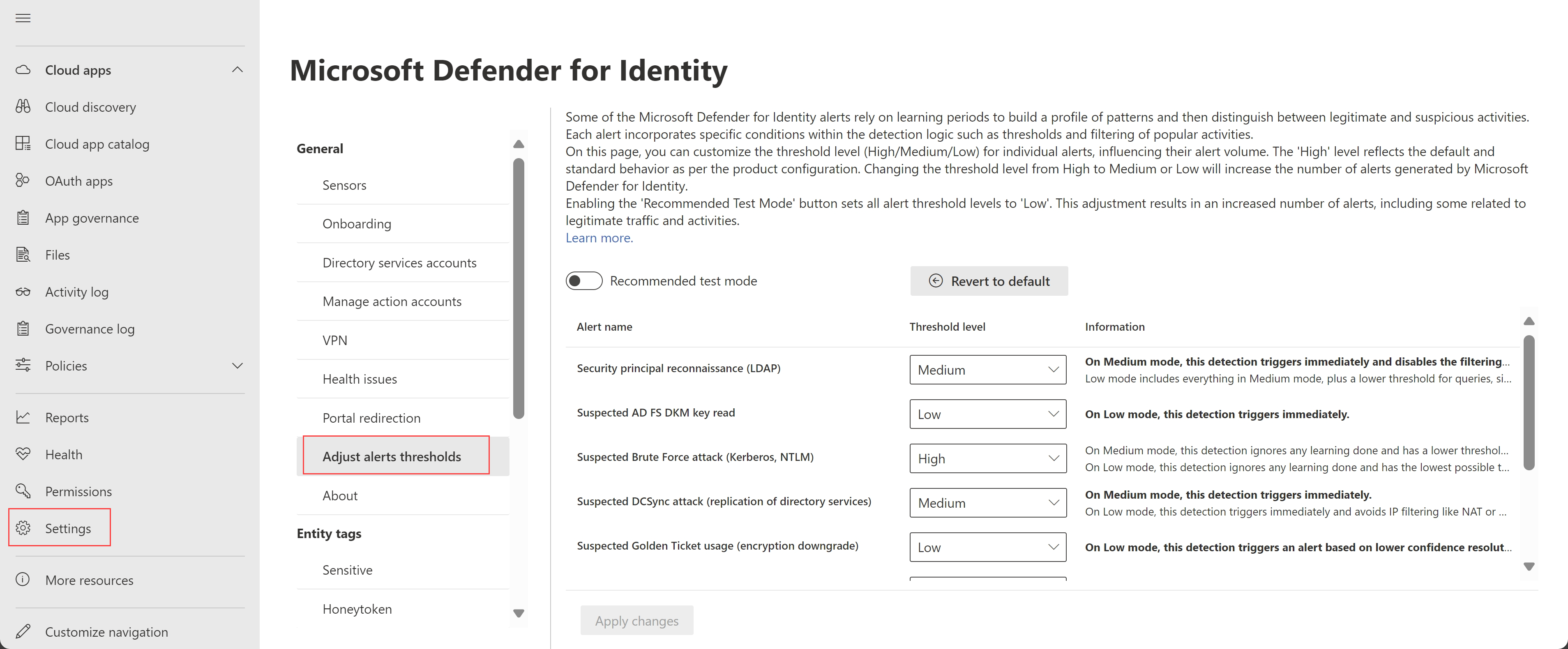 Recommended test mode configuration on the Adjust alert thresholds page, now requires you to set an expiration time (up to 60 days) when enabling it. The end time is shown next to the toggle while test mode is active. For customers who already have Recommended test mode enabled, a 60-day expiration is automatically applied.