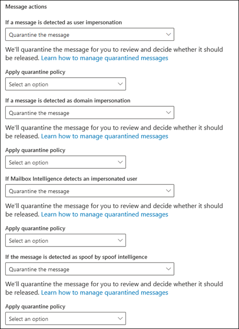 | Mailbox intelligence impersonation (MailboxIntelligenceProtectionAction) | Yes (MailboxIntelligenceQuarantineTag) |