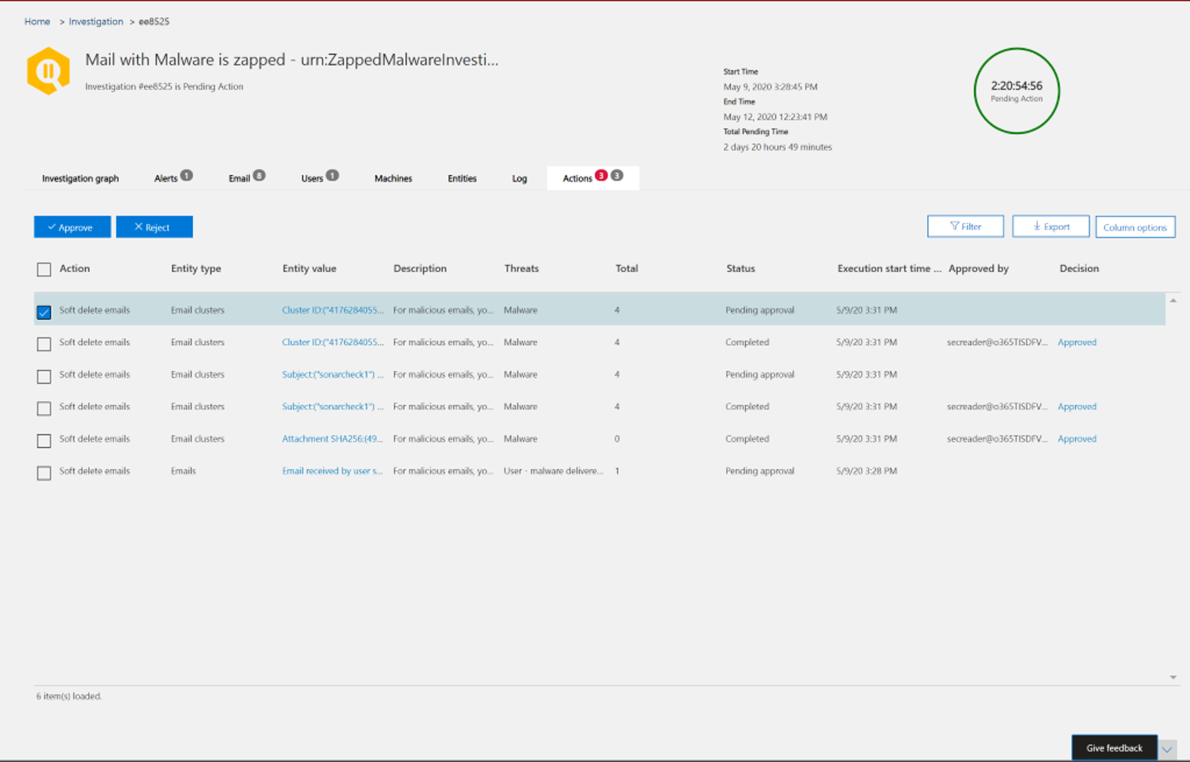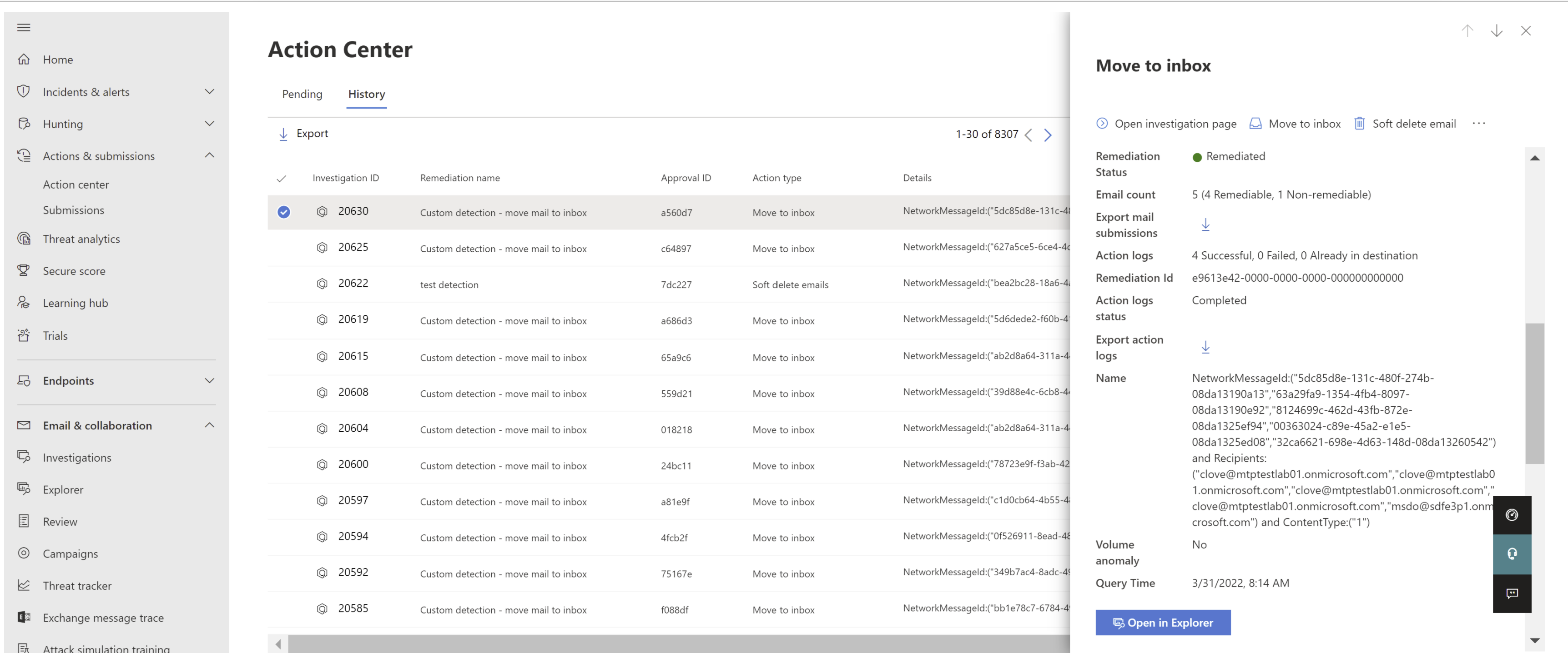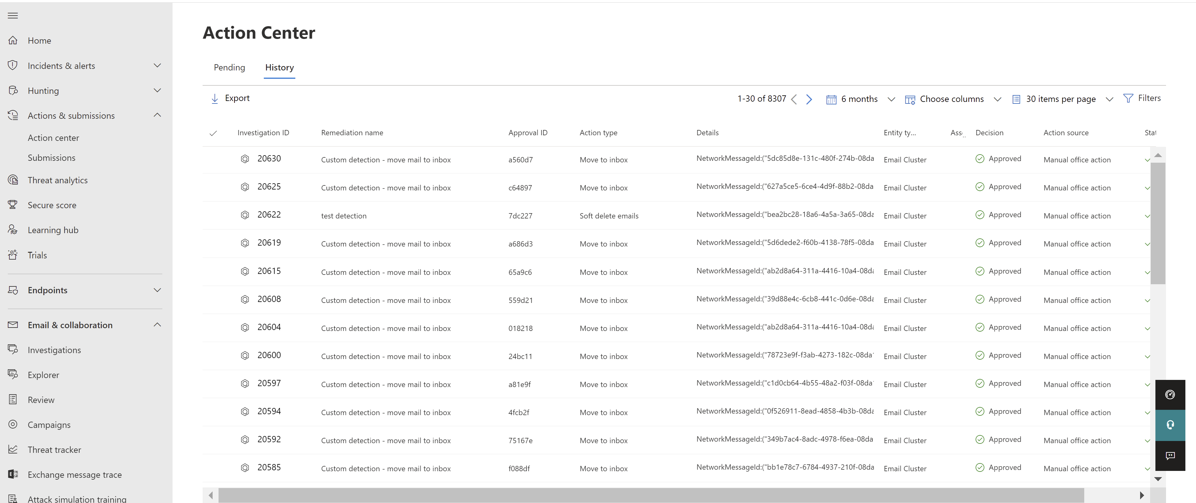 Unified Action Center shows remediation actions for the past 30 days. Actions taken through Explorer are listed by the name that the security operations team provided when the remediation was created as well as approval ID, Investigation ID. Actions taken through automated investigations have titles that begin with the related alert that triggered the investigation, such as Zap email cluster.