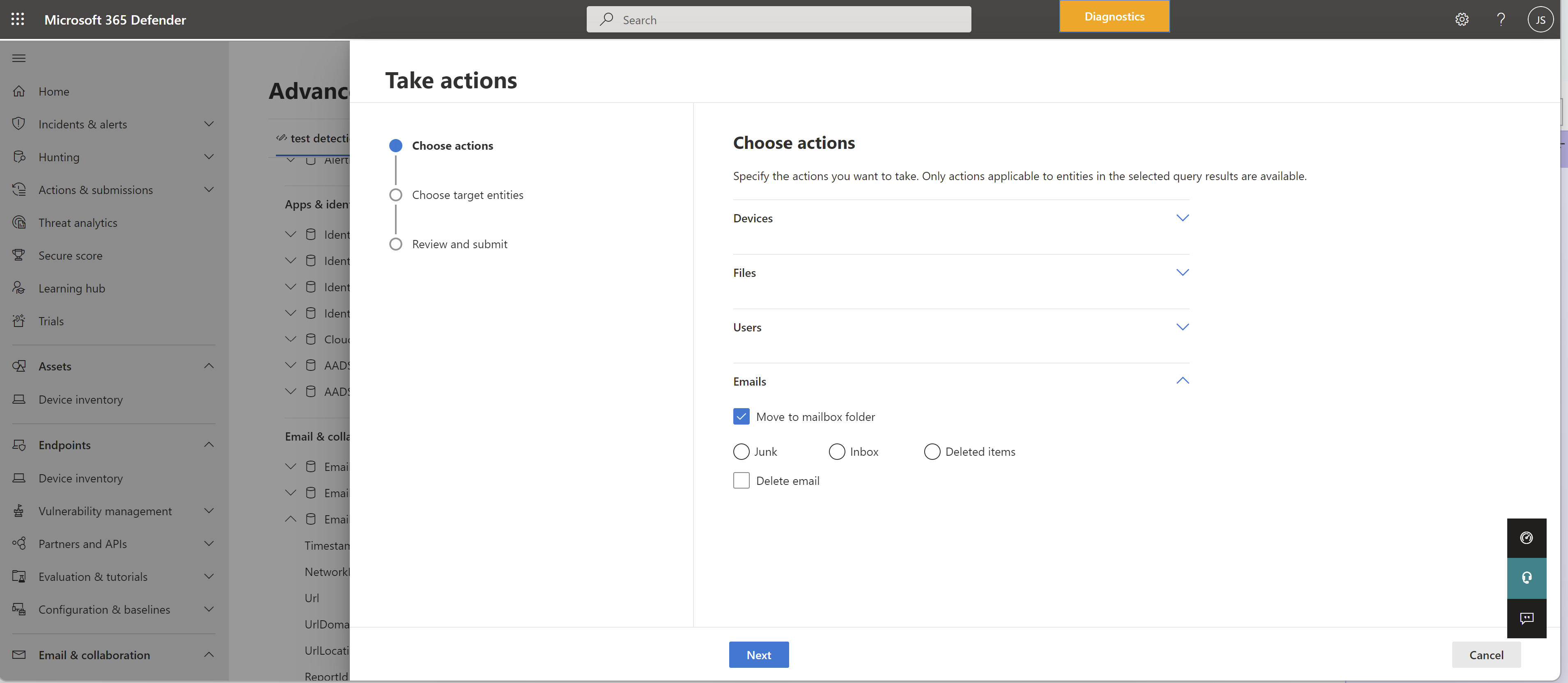 Admins can take remediation actions like moving email messages to Junk, Inbox, or Deleted items folder and delete actions like soft deleted or hard delete from Advanced Hunting pages.