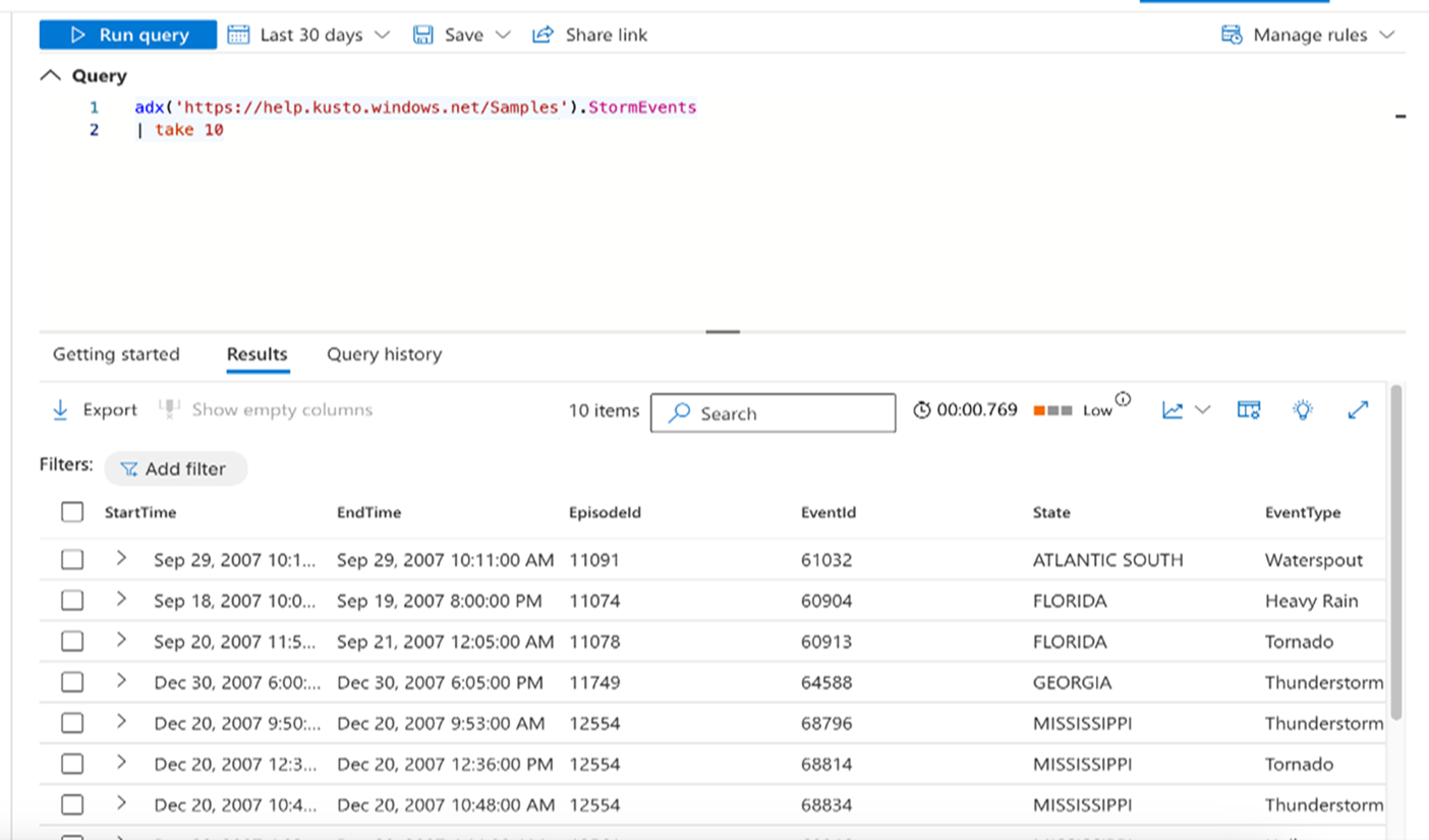 For example, to get the first 10 rows of data from the StormEvents table stored in a certain URI:
