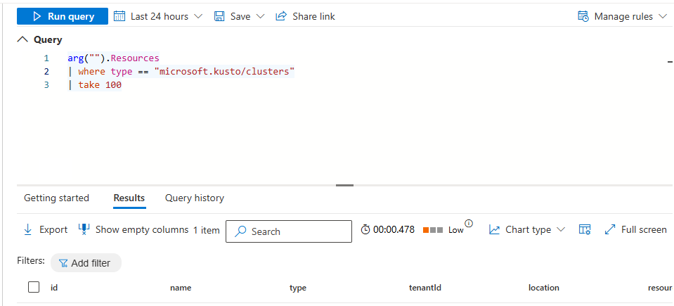 In the query editor, enter arg(""). followed by the Azure Resource Graph table name.