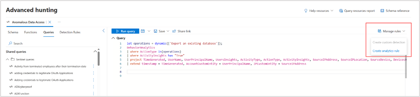 You can create custom detection rules that query data from both Microsoft Sentinel and Defender XDR tables. Select Manage rules > Create custom detection. Read Create custom detection rules for more information.