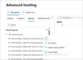 To use a saved query from Microsoft Sentinel, go to the Queries tab and scroll until you find the query that you want. Double-click the query name to load the query in the query editor. For more options, select the vertical ellipses (