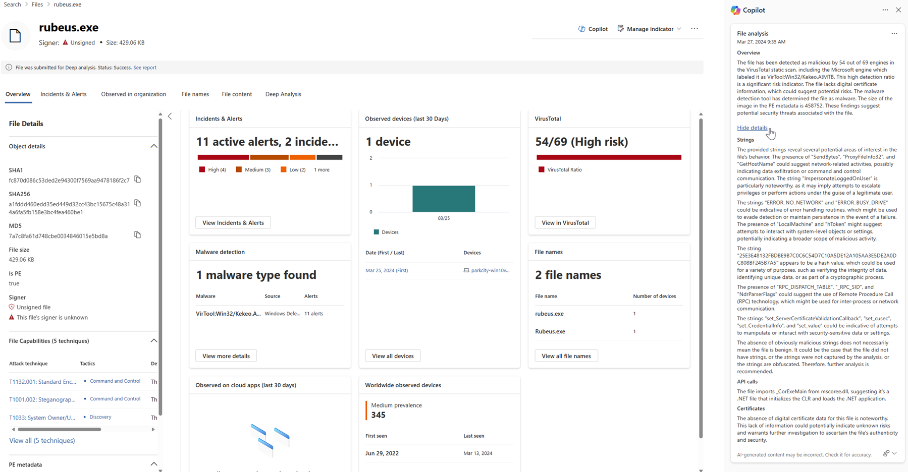 Microsoft Security Copilot in the Microsoft Defender portal enables security teams to quickly identify malicious and suspicious files through AI-powered file analysis capabilities.