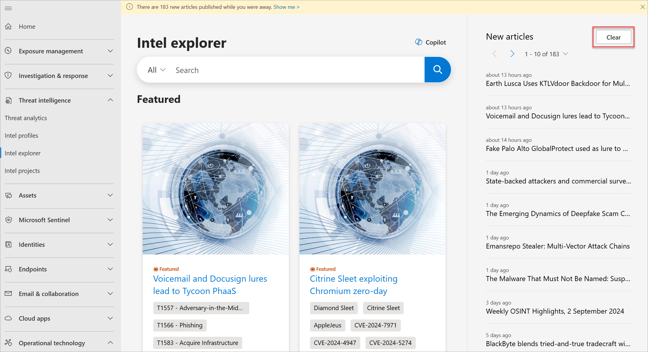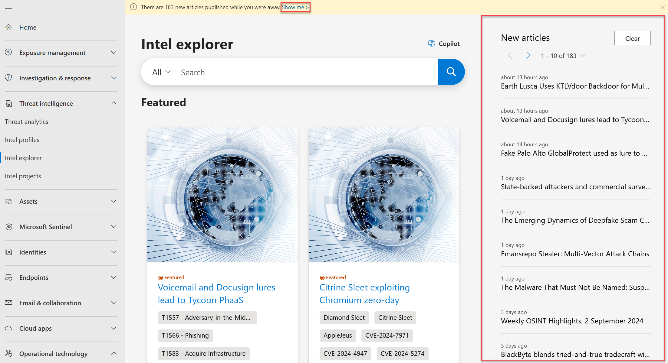 In the Intel explorer page, a banner message notifies you of the number of new Defender TI articles that were published since you last accessed the Defender portal. Select Show me to open a flyout panel that lists the articles you might have missed, then select any of the listed articles to open it: