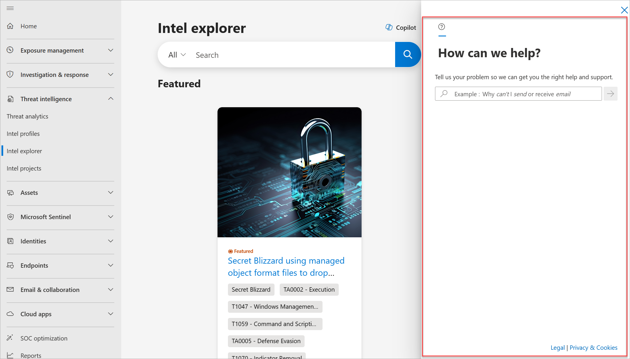Select the Help icon in the upper right-hand corner of the Defender portal. The side panel displays a search bar where you can type your problem or support question.