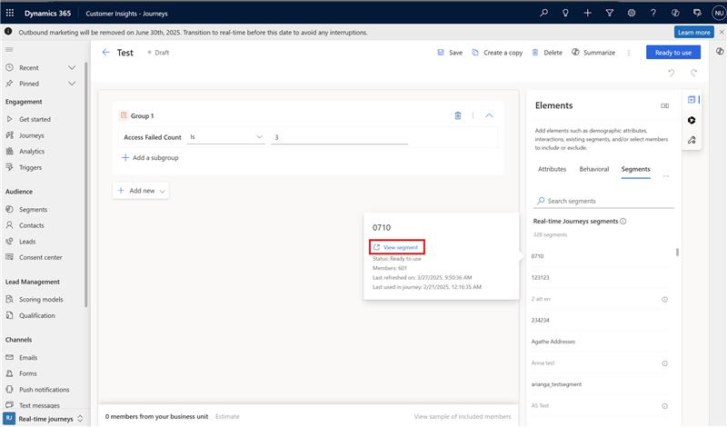 Improve marketing return on investment by targeting the right audience. Build segments directly in Dynamics 365 Customer Insights - Journeys with the powerful, easy-to-use logic builder that doesn't require specialized knowledge of complex data structures or logical operators. Preview the estimated segment size and membership before you mark your segment as "Ready to use" in customer journeys.