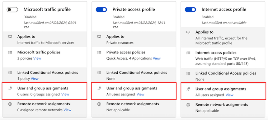 The screenshot illustrates the setting. The Microsoft profile is disabled and is assigned to zero users and groups. The Private Access and Internet Access profiles are enabled and are assigned to all users.
