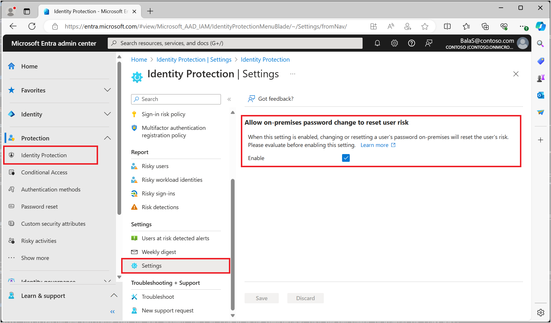 - Enable the Allow on-premises password change to reset user risk setting in Microsoft Entra ID Protection.