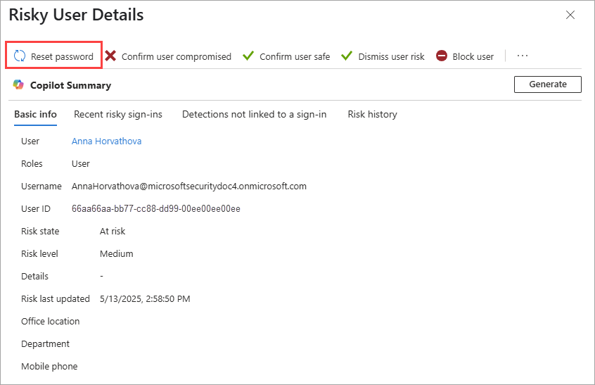 Browse to Protection > Identity Protection > Risky users, and select the affected user.