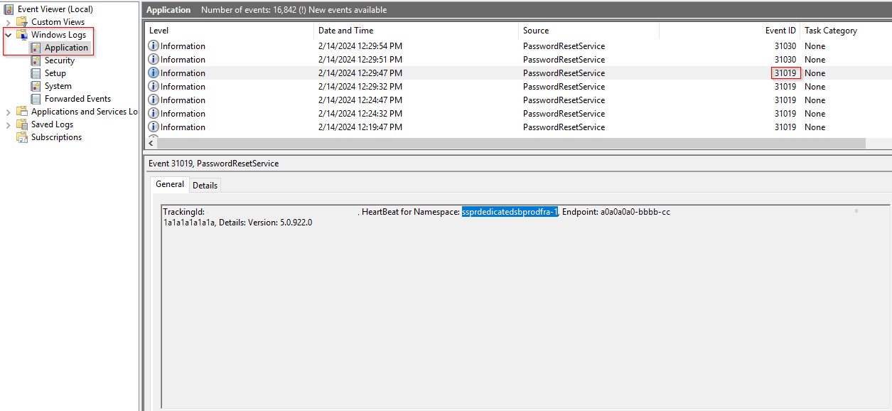 | 31044 | PasswordResetService | This event indicates that password writeback isn't working. The Service Bus listens for requests on two separate relays for redundancy. Each relay connection is managed by a unique Service Host. The writeback client returns an error if either Service Host isn't running. |