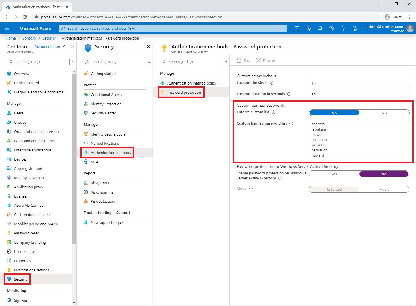 - Browse to Entra ID > Authentication methods, then Password protection.