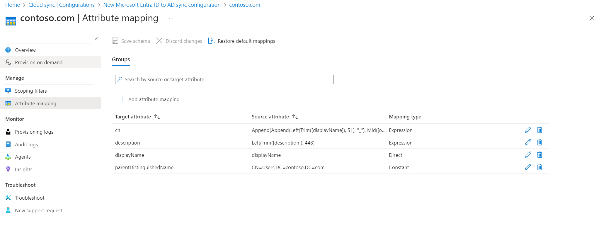 Currently, the AD Schema isn't discoverable and there's fixed set of mappings. The following table provides the default mappings and schema for the Microsoft Entra ID to Active Directory configurations.
