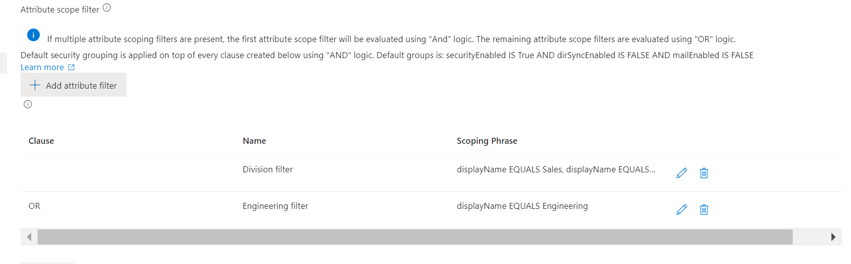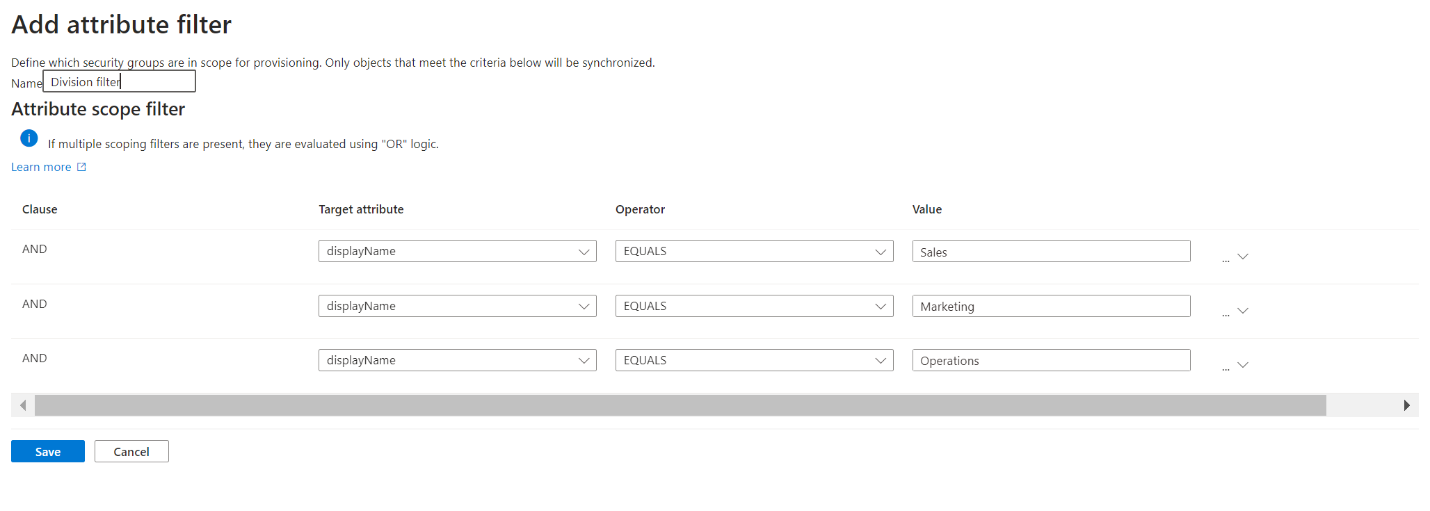 Finally, multiple scoping filters can be created for a group. If multiple scoping filters are present, they're evaluated together by using "OR" logic. The "OR" logic means that if either of the clauses in any of the configured scoping filters evaluate to "true", the group is provisioned.
