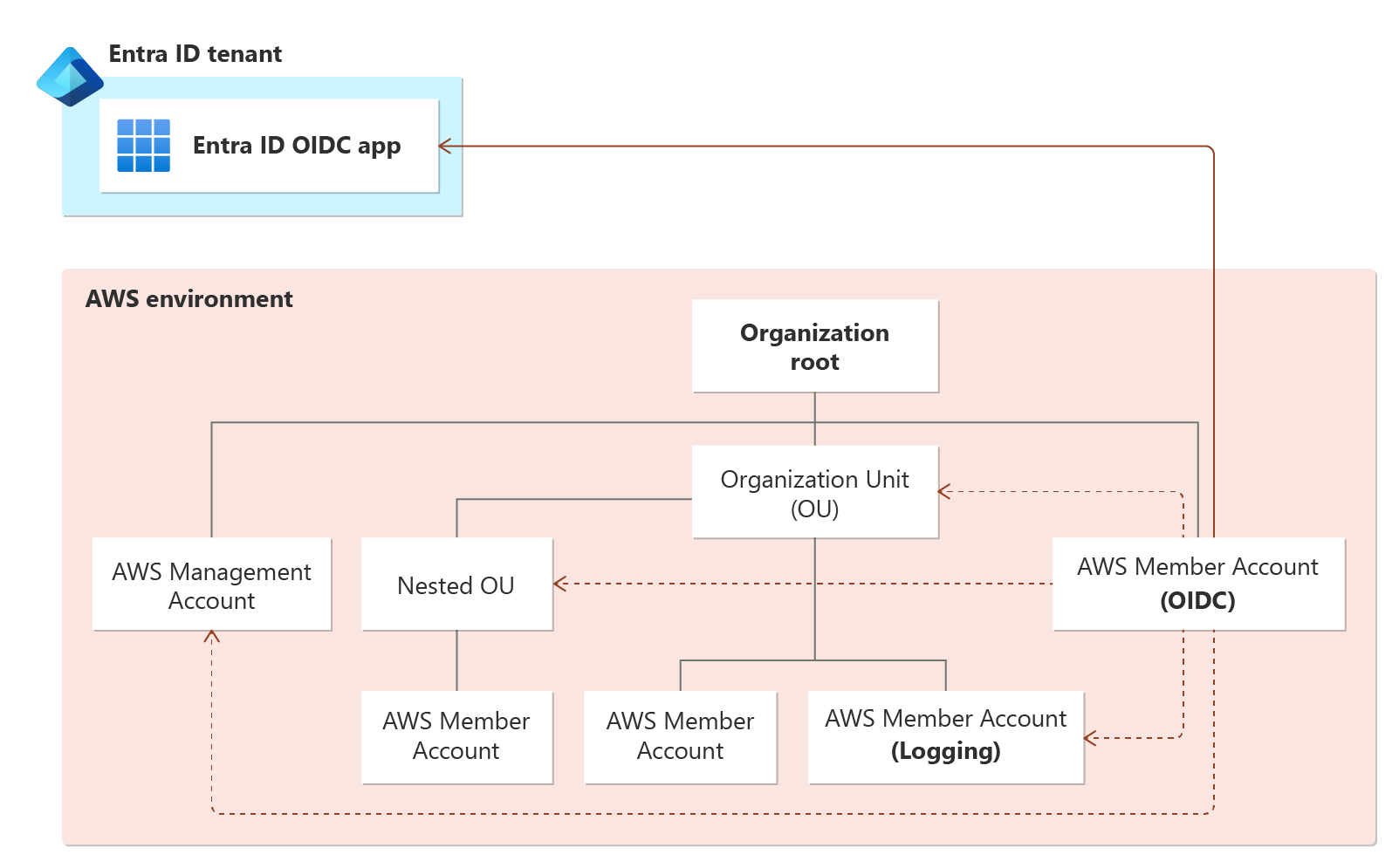 - AWS OIDC account: An AWS member account designated by you to create and host the OIDC connection through an OIDC IdP