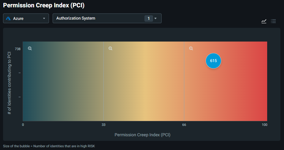 The PCI graph may display one or more bubbles. Each bubble displays the number of identities that are considered high risk. High-risk refers to the number of users who have permissions that exceed their normal or required usage.