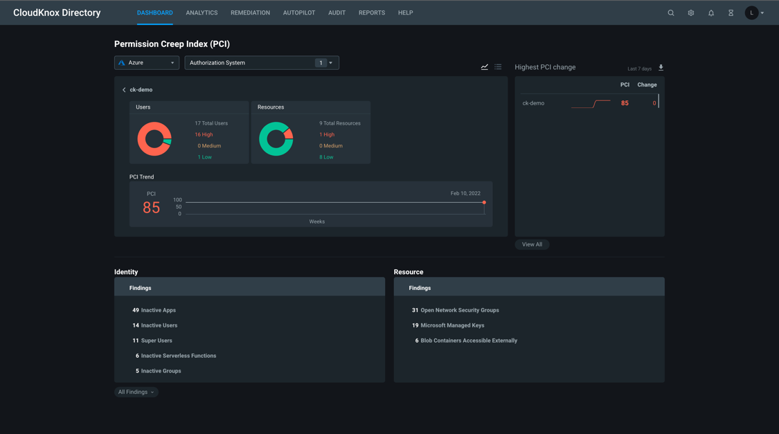 - The number of users who contribute to the permission creep index (PCI) and where they are on the scale.