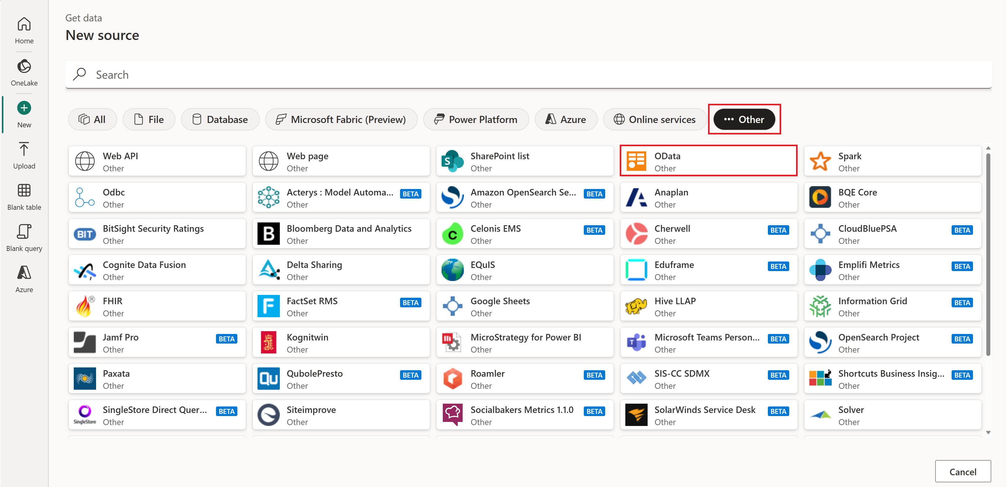 Let's get some data! In this example, you're getting data from an OData service. Use the following steps to get data in your dataflow.